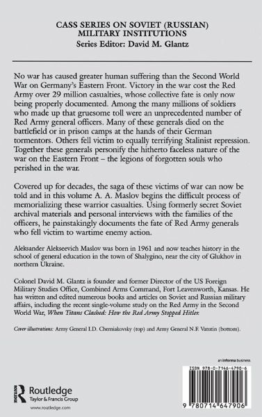 No war has caused greater human suffering than the Second World War on Germany's Eastern Front. Victory in the war cost the Red Army over 29 million casualties, whose collective fate is only now being properly documented. Among the many millions of soldiers who made up that gruesome toll were an unprecedented number of Red Army general officers. Many of these perished on the battlefield or in prison camps at the hands of their German tormentors. Others fell victim to equally terrifying Stalinist repression. Together these generals personify the faceless nature of the war of the Eastern Front - the legions of forgotten souls who perished in the war. Covered up for decades, the saga of these victims of war can now be told and in this volume, A A Maslov begins the difficult process of memorializing these warrior casualties. Using formerly secret Soviet archival materials and personal interviews with the families of the officers, he painstakingly documents the fate of Red Army generals who fell victim to wartime enemy action.