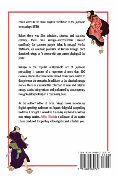 Fallen words is the literal English translation of the Japanese term rakugo (¿¿). Before there was film, television, sitcoms, and standup comedy, there was rakugo-entertainment created specifically for common people. What is rakugo? Noriko Watanabe, an assistant professor at Baruch College, once described rakugo as "a sitcom with one person playing all the parts." Rakugo is the popular 400-year-old art of Japanese storytelling. It consists of a repertoire of more than 500 classical stories that have been passed down from master to disciple over the centuries. In addition to the classical rakugo stories, there is a substantial collection of new and original rakugo stories being written and performed by contemporary rakugoka (storytellers) on a continuing basis. As the author/ editor of three rakugo books introducing English-speaking audiences to Japan's delightful storytelling tradition, I thought it would be fun to compile and release a collection of my own original English rakugo stories. I hope these stories will enlighten and entertain you.