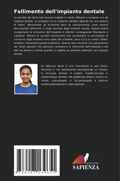 La perdita dei denti può essere trattata in modo efficace e costante con gli impianti dentali. La prognosi di un impianto dentale dipende da una pletora di fattori. Nonostante gli eccellenti tassi di sopravvivenza, sono ancora documentati fallimenti a lungo termine degli impianti dentali. Questi eventi comportano la rimozione dell'impianto e ulteriori conseguenze finanziarie e sanitarie. Mentre le variabili estrinseche che aumentano le percentuali di successo degli impianti sono state ben studiate, poco si sa su come i fattori ereditari influenzino questo problema. Questo libro fornisce una panoramica dei fattori genetici che possono contribuire al fallimento dell'impianto e dei fatti da tenere a mente quando si riabilita un paziente edentulo con impianti dentali.
