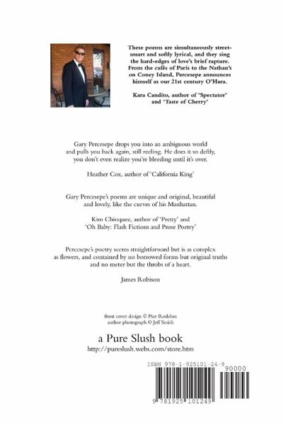 a collection of 59 poems Percesepe's poetry seems straightforward but is as complex as flowers, as summer shade and layers of snowfall, available to all but folded around secrets only broken lovers or philosophers grasp, and contained by no borrowed forms but original truths and no meter but the throbs of a heart. He here assays breakfast making and love making and loss and memory and time and husbands and wives and offspring and always, always, the elegance of the line, the object plain or sublime or both, the landscapes of sex, sorrow and high style. James Robison Gary Percesepe drops you into an ambiguous world and pulls you back again, still reeling. He does it so deftly, you don't even realize you're bleeding until it's over. Heather Cox, author of California King