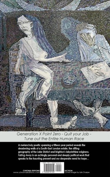 Generation X Point Zero - Quit your Job - Tune out the Entire Human Race... Trapped inside a culture of booze, drugs and cracked aspirations, the narrator's attempt for anonymity amidst the chaos of society begins to collapse. Scarred by the September 11th attacks, the subsequent War on Terror and fall out of austerity, a stuttering journey towards disappearance is laden with insomnia, rootlessness and bereavement. A melancholy poetic spanning a fifteen year period reveals the deadening walls of a South-East London estate, the stifling geography of the Lake District and Brighton's labyrinthine edginess. Each encounter - a bar, corner shop, gallery, library or hospital ward is increasingly filled with surreal menace. Ultimately, the threat is real, in a world populated with unease, confusion and sadness. Falling Away is an achingly personal and deeply political work that speaks to the haunting present and our desperate need for hope...