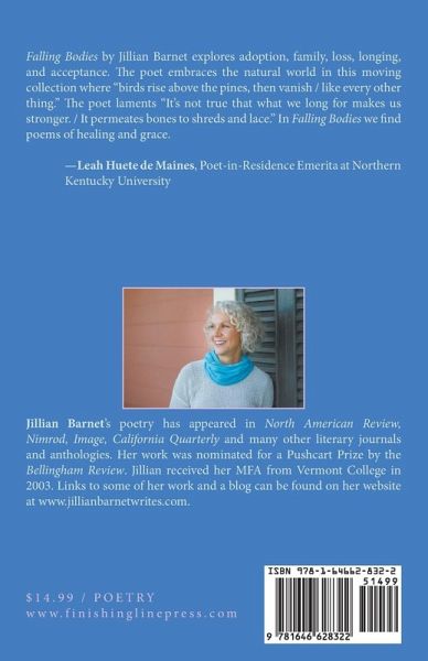 Falling Bodies, a chapbook of poems from Finishing Line Press, explores loss, identity, and family through the lens of the natural world. The book, part of Finishing Line's acclaimed Chapbook Series, is by Finger Lakes area author, Jillian Barnet, whose poems speak to universal issues, but are born of the author's particular experience as an adoptee, mother, and lover in he landscape of her former home in Western Pennsylvania. From the self as a Roman ruin to God as a big-handed homeboy, from Copernican systems to the doubt and lust of Darwin's wife, the poet's imagination is as far-reaching as her gaze is unflinching. The poems "shudder, dither / in the risen wind against savage blue." Using sensuous images of the natural world, the poet explores "the portage of grief," "the coming / to pass of the past, its inevitable laying hold." Barnet's poetry has appeared in North American Review, Crab Orchard Review, Image, and elsewhere. Her poem, "Egg," which is featured in Falling Bodies, was nominated by Bellingham Review for a Pushcart Prize.