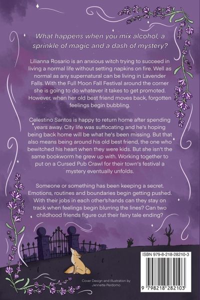 Lilianna Rosario is an anxious witch trying to succeed in living a normal life without setting napkins on fire. Well as normal as any supernatural can be living in Lavender Falls. With the Full Moon Fall Festival around the corner she is going to do whatever it takes to get promoted. However when her old best friend moves back, forgotten feelings begin bubbling. Celestino Santos is happy to return home after spending years away. City life was suffocating and he's hoping being back home will be what he's been missing. But that also means being around his old best friend, the one who bewitched his heart when they were kids. But she isn't the same bookworm he grew up with. Working together to put on a Cursed Pub Crawl for their town's festival a mystery eventually unfolds. Someone or something has been keeping a secret. Emotions, routines and boundaries begin getting pushed. With their jobs in each other's hands can they stay on track when feelings begin blurring the lines? Can two childhood friends figure out their fairy tale ending?