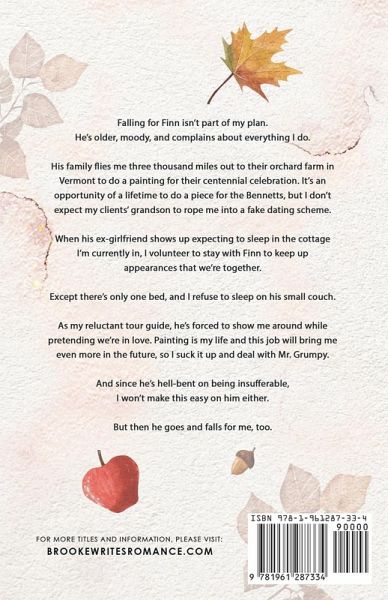 Falling for Finn isn't part of my plan. He's older, moody, and complains about everything I do. His family flies me three thousand miles out to their orchard farm in Vermont to do a painting for their centennial celebration. It's an opportunity of a lifetime to do a piece for the Bennetts, but I don't expect my clients' grandson to rope me into a fake dating scheme. When his ex-girlfriend shows up expecting to sleep in the cottage I'm currently in, I volunteer to stay with Finn to keep up appearances that we're together. Except there's only one bed, and I refuse to sleep on his small couch. As my reluctant tour guide, he's forced to show me around while pretending we're in love. Painting is my life and this job will bring me even more in the future, so I suck it up and deal with Mr. Grumpy. And since he's hell-bent on being insufferable, I won't make this easy on him either. But then he goes and falls for me, too.