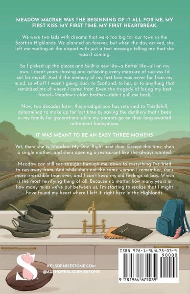 Meadow Macrae was the beginning of it all for me. My first kiss. My first time. My first heartbreak. We were two kids with dreams that were too big for our town in the Scottish Highlands. We planned on forever, but when the day arrived, she left me waiting at the airport with just a text message telling me that she wasn't coming. So I picked up the pieces and built a new life-a better life-all on my own. I spent years chasing and achieving every measure of success I'd set for myself. And if the memory of my first love was never far from my mind, so what? I wasn't going back to Scotland, to her, or to anything that reminded me of where I came from. Even the tragedy of losing my best friend-Meadow's older brother-didn't pull me back. Now, two decades later, this prodigal son has returned to Thistlehill, determined to make up for lost time by saving the distillery that's been in my family for generations while my parents go on their long-awaited retirement honeymoon. It was meant to be an easy three months. Yet, there she is. Meadow. My Doe. Right next door. Except this time, she's a single mother, and she's opening a restaurant like she always wanted. Meadow can still see straight through me, down to everything I've tried to run away from. And while she's not the same woman I remember, she's more irresistible than ever, and I can't keep my old feelings at bay. Which is the most terrifying thing of all. Because no matter how many years or how many miles we've put between us, I'm starting to realize that I might have found my heart where I left it: right here in the Highlands.