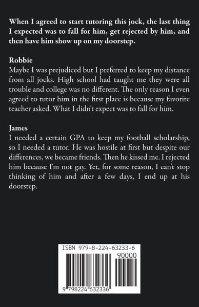 When I agreed to start tutoring this jock, the last thing I expected was to fall for him, get rejected by him, and then have him show up on my doorstep. Robbie Maybe I was prejudiced but I preferred to keep my distance from all jocks. High school had taught me they were all trouble and college was no different. The only reason I even agreed to tutor him in the first place is because my favorite teacher asked. What I didn't expect was to fall for him. James I needed a certain GPA to keep my football scholarship, so I needed a tutor. He was hostile at first but despite our differences, we became friends. Then he kissed me. I rejected him because I'm not gay. Yet, for some reason, I can't stop thinking of him and after a few days, I end up at his doorstep.
