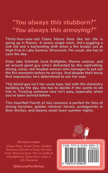 "You always this stubborn?" "You always this annoying?" Thirty-two-year-old Claire Moore feels like her life is going up in flames. A newly single mom, she's juggling a sick kid and a bartending shift when a fire breaks out at High Five in Lake Geneva, Wisconsin. Per usual, she has to save the day. Enter Jake Schmidt: local firefighter, Marine veteran, and all around good guy who's distracted by the captivating, strong, sassy, red-headed woman who manages to put out the fire moments before he arrives. And despite their tense first impression, he's determined to win her over. This blond guy isn't her usual type, but with the chemistry building by the day, she has to decide if she wants to let him in. Trusting someone new isn't easy, especially when you've been burned before. This heartfelt Fourth of July romance is perfect for fans of strong heroines, golden retriever heroes, protagonists in their thirties, and steamy small town summer nights. Romance Tropes: Single Mom, Small Town, Holiday Romance (Fourth of July), He Falls First, Pleasure Dom, Men in Uniform (Firefighters), Slow Burn, Later in Life Romance