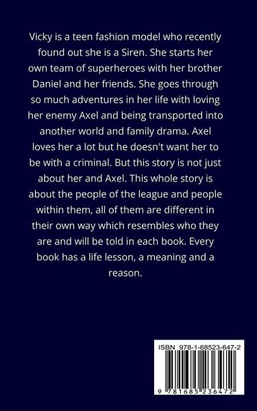 Vicky is a teen fashion model who recently found out she is a Siren. She starts her own team of superheroes with her brother Daniel and her friends. She goes through so many adventures in her life with loving her enemy Axel and being transported into another world and family drama. Axel loves her a lot but he doesn't want her to be with a criminal. But this story is not just about her and Axel. This whole story is about the people of the league and people within them, all of them are different in their own way which resembles who they are and will be told in each book. Every book has a life lesson, a meaning, and a reason.