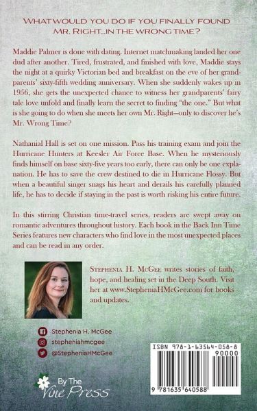 What would you do if you finally found Mr. Right...in the wrong time? Maddie Palmer is done with dating. Internet matchmaking landed her one dud after another. Tired, frustrated, and finished with love, Maddie stays the night at a quirky Victorian bed and breakfast on the eve of her grandparents' sixty-fifth wedding anniversary. When she suddenly wakes up in 1956, she gets the unexpected chance to witness her grandparents' fairy tale love unfold and finally learn the secret to finding "the one." But what is she going to do when she meets her own Mr. Right-only to discover he's Mr. Wrong Time? Nathanial Hall is set on one mission. Pass his training exam and join the Hurricane Hunters at Keesler Air Force Base. When he mysteriously finds himself on base sixty-five years too early, there can only be one explanation. He has to save the crew destined to die in Hurricane Flossy. But when a beautiful singer snags his heart and derails his carefully planned life, he has to decide if staying in the past is worth risking his entire future. ¿ The Back Inn Time series books are fun, faith-filled stories of what it might be like to suddenly experience life in a different time. These clean historical romances are packed with humor and adventure. Perfect for fans of dual timeline or time slip stories and Christian historical romance, these books answer the question every historical fiction fan wonders-what would it be like if I went back to that time? If you enjoy the wholesomeness of Amish, Western, or frontier fiction and adore romantic comedies, then a visit to a seaside Victorian inn where you can "step back inn time and leave your troubles behind!" is for you.
