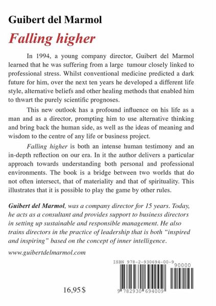 In 1994, a young company director, Guibert del Marmol learned that he was suffering from a large tumour closely linked to professional stress. Whilst conventional medicine predicted a dark future for him, over the next ten years he developed a different life style, alternative beliefs and other healing methods that enabled him to thwart the purely scientific prognoses. This new outlook has a profound influence on his life as a man and as a director, prompting him to use alternative thinking and bring back the human side, as well as the ideas of meaning and wisdom to the centre of any life or business project. Falling higher is both an intense human testimony and an in-depth reflection on our era. In it the author delivers a particular approach towards understanding both personal and professional environments. The book is a bridge between two worlds that do not often intersect, that of materiality and that of spirituality. This illustrates that it is possible to play the game by other rules.