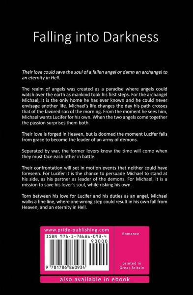 Their love could save the soul of a fallen angel or damn an archangel to an eternity in Hell. The realm of angels was created as a paradise where angels could watch over the earth as mankind took his first steps. For the archangel Michael, it is the only home he has ever known and he could never envisage another life. Michael’s life changes the day his path crosses that of the favored son of the morning. From the moment he sees him, Michael wants Lucifer for his own. When the two angels come together the passion surprises them both. Their love is forged in Heaven, but is doomed the moment Lucifer falls from grace to become the leader of an army of demons. Separated by war, the former lovers know the time will come when they must face each other in battle. Their confrontation will set in motion events that neither could have foreseen. For Lucifer it is the chance to persuade Michael to stand at his side, as his partner as leader of the demons. For Michael, it is a mission to save his lover’s soul, while risking his own. Torn between his love for Lucifer and his duties as an angel, Michael walks a fine line, where one wrong step could result in his own fall from Heaven, and an eternity in Hell.
