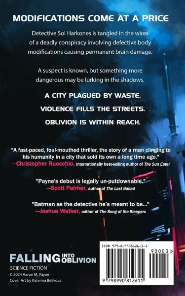 MODIFICATIONS COME AT A PRICE. Detective Sol Harkones is tangled in the wires of a deadly conspiracy involving defective body modifications causing permanent brain damage. A suspect is known, but something more dangerous may be lurking in the shadows. A city plagued by waste. Violence fills the streets. Oblivion is within reach. Falling Into Oblivion is the electrifying first book in the Tendrils of Chrome cyberpunk sci-fi series. If you're a fan of William Gibson's Neuromancer, HBO's True Detective, or Philip K. Dick's Blade Runner, you will love Aaron M. Payne's rapid-fire saga.