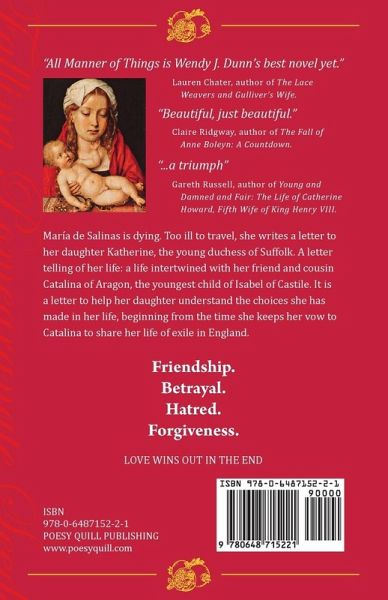 Winter, 1539: María de Salinas is dying. Too ill to travel from her London home, she writes a letter to her daughter Katherine, the young duchess of Suffolk. A letter telling of her life: a life intertwined with her friend and cousin Catalina of Aragon, the youngest child of Isabel of Castile. It is a letter to help her daughter understand the choices she has made in her life, beginning from the time she keeps her vow to Catalina to share her life of exile in England. Friendship. Betrayal. Hatred. Forgiveness. Will love win out in the end?