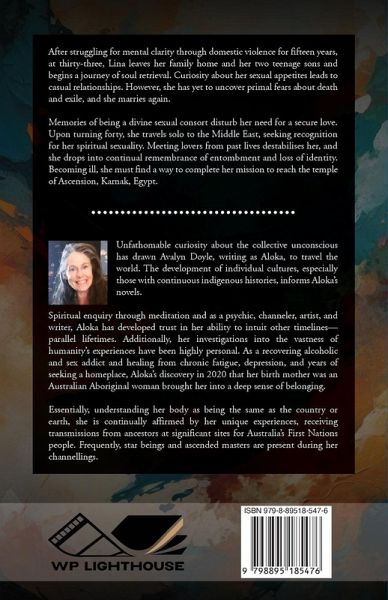 After struggling for mental clarity through domestic violence for fifteen years, at thirty-three, Lina leaves her family home and her two teenage sons and begins a journey of soul retrieval. Curiosity about her sexual appetites leads to casual relationships. However, she has yet to uncover primal fears about death and exile, and she marries again. Memories of being a divine sexual consort disturb her need for a secure love. Upon turning forty, she travels solo to the Middle East, seeking recognition for her spiritual sexuality. Meeting lovers from past lives destabilises her, and she drops into continual remembrance of entombment and loss of identity. Becoming ill, she must find a way to complete her mission to reach the temple of Ascension, Karnak, Egypt.