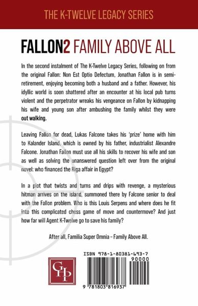 In the second instalment of The K-Twelve Legacy Series, following on from the original Fallon: Non Est Optio Defectum, Jonathan Fallon is in semi-retirement, enjoying becoming both a husband and a father. However, his idyllic world is soon shattered after an encounter at his local pub turns violent and the perpetrator wreaks his vengeance on Fallon by kidnapping his wife and young son after ambushing the family whilst they were out walking. Leaving Fallon for dead, Lukas Falcone takes his 'prize' home with him to Kalander Island, which is owned by his father, industrialist Alexandre Falcone. Jonathan Fallon must use all his skills to recover his wife and son as well as solving the unanswered question left over from the original novel: who financed the Riga affair in Egypt? In a plot that twists and turns and drips with revenge, a mysterious hitman arrives on the island, summoned there by Falcone senior to deal with the Fallon problem. Who is this Louis Serpens and where does he fit into this complicated chess game of move and countermove? And just how far will Agent K-Twelve go to save his family? After all, Familia Super Omnia - Family Above All.