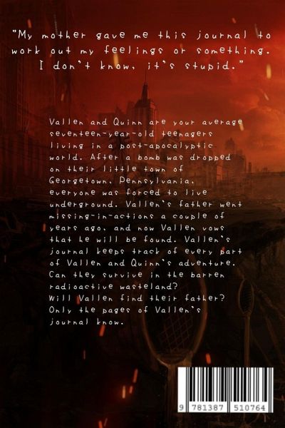 Vallen and Quinn are your average seventeen-year-old teenagers living in a post-apocalyptic world. After a bomb was dropped on their little town of Georgetown, Pennsylvania, everyone was forced to live underground. Vallen's father went missing-in-actions a couple of years ago, and now Vallen vows that he will be found. Vallen's journal keeps track of every part of Vallen and Quinn's adventure. Can they survive in the barren radioactive wasteland? Will Vallen find their father? Only the pages know.