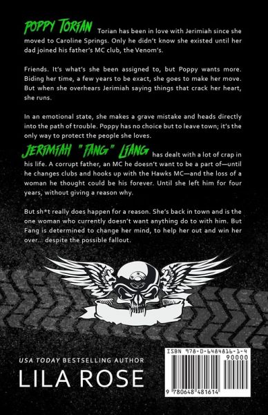 Poppy Torian has been in love with Jerimiah since she moved to Caroline Springs. Only he didn’t know she existed until her dad joined his father’s MC club, the Venoms. Friends. It’s what she's been resigned to, but Poppy wants more. Biding her time, a few years to be exact, she goes to make her move. But when she overhears Jerimiah saying things that crack her heart, she runs. In an emotional state, she makes a grave mistake and heads directly into the path of trouble. Poppy has no choice but to leave town; it’s the only way to protect the people she loves. Jerimiah "Fang" Liang has dealt with a lot of crap in his life. A corrupt father, an MC he doesn’t want to be a part of—until he changes clubs and hooks up with the Hawks MC—and the loss of a woman he thought could be his forever. Until she left him for four years, without giving a reason why. But sh*t really does happen for a reason. She’s back in town and is the one woman who currently doesn’t want anything do to with him. But Fang is determined to change her mind, to help her out and win her over… despite the possible fallout.