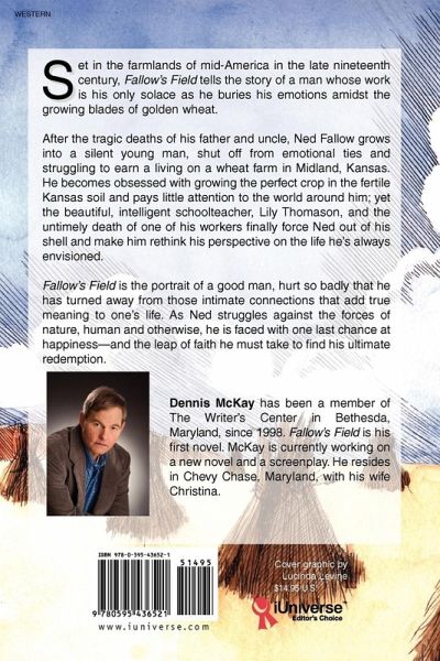 Set in the farmlands of mid-America in the late nineteenth century, Fallow's Field tells the story of a man whose work is his only solace as he buries his emotions amidst the growing blades of golden wheat. After the tragic deaths of his father and uncle, Ned Fallow grows into a silent young man, shut off from emotional ties and struggling to earn a living on a wheat farm in Midland, Kansas. He becomes obsessed with growing the perfect crop in the fertile Kansas soil and pays little attention to the world around him; yet the beautiful, intelligent schoolteacher, Lily Thomason, and the untimely death of one of his workers finally force Ned out of his shell and make him rethink his perspective on the life he's always envisioned. Fallow's Field is the portrait of a good man, hurt so badly that he has turned away from those intimate connections that add true meaning to one's life. As Ned struggles against the forces of nature, human and otherwise, he is faced with one last chance at happiness-and the leap of faith he must take to find his ultimate redemption.