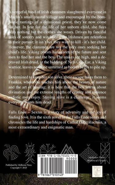 A vengeful band of Irish clansmen slaughtered everyone in Macha's small coastal village and encouraged by the bombastic rantings of a delusional Catholic priest, they've now come for her. In fear for the life of her unborn child, she flees with nothing but the clothes she wears. Driven by fanciful tales of sorcery and witchcraft, the Irishmen are relentless in their pursuit; it isn't her they want to kill - it's her child. However, the clansmen are not the only ones seeking her child's life. Viking priests have foretold the future and sent men to find her and the boy. The stakes are high, and a depraved Irish druid, at the bidding of Nels One-Ear, a Viking warrior, leaves no stone unturned as bodies begin to pile up. Determined to keep her son alive, their escape takes them to Frankia, where she teaches him about the beauty of nature and the art of healing; it is here that the boy learns about divination and the extreme lengths of cruelty and violence sadistic men enjoy. Staying alive is a challenge; it seems everyone wants him dead. Falls Ende - Sextus is a story of adversity and the joy of finding love. It is the sixth novel in the Falls Ende series and chronicles the life and hardships of Cathal Ó Brollacháin, a most extraordinary and enigmatic man.