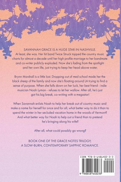 Savannah Grace is a huge star in Nashville. At least, she was. Her hit band Twice Struck topped the country music charts for almost a decade until her high profile marriage to her bandmate and co-writer publicly exploded. Now she's fading from the spotlight and her own life, just trying to keep her head above water. Brynn Marshall is a little lost. Dropping out of med school made her the black sheep of the family and now she's floating around LA trying to find a sense of purpose. When she falls down on her luck, her best friend - indie musician Noah Lyman - refuses to let her wallow. After all, he's just got his big break, co-writing with a megastar! When Savannah enlists Noah to help her break out of country music and make a name for herself for once and for all, what better way to do it than to spend the winter in her secluded vacation home in the woods of Vermont? And what better way for Noah to help out a friend than to pretend he's bringing along his wife? After all, what could possibly go wrong? Book One of the Grace Notes Trilogy: a slow-burn, contemporary sapphic romance