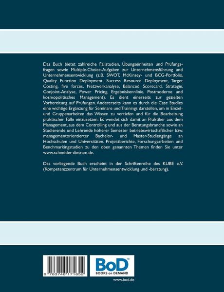 Das Buch bietet zahlreiche Fallstudien, Übungseinheiten und Prüfungs-fragen sowie Multiple-Choice-Aufgaben zur Unternehmensführung und Unternehmensentwicklung (z. B. SWOT, McKinsey- und BCG-Portfolio, Quality Function Deployment, Success Resource Deployment, Target Costing, Make-or-Buy-Portfolio, Kostendegression, Erfahrungskurve, Benchmarking, Potenzialanalyse, Ergebniskennlinie, Wertschöpfungsstrukturanalyse, Wertkettenlandkarte, five forces, Netzwerkanalyse, Balanced Scorecard, PIMS, RMA-Schätzung, Unternehmensstrategie, Conjoint-Analyse). Es dient einerseits zur gezielten Vorbereitung auf Prüfungen. Andererseits kann es durch die Case Studies eine wichtige Ergänzung für Seminare und Trainings darstellen, um in Einzel- und Gruppenarbeiten das Wissen zu vertiefen und für die Bearbeitung praktischer Fälle einzusetzen. Es wendet sich damit an Praktiker aus dem Management, aus dem Controlling und aus der Beratungsbranche sowie an Studierende und Lehrende in den höheren Semester betriebs-wirtschaftlicher bzw. managementorientierter Bachelor- und Master-Studiengänge an Hochschulen und Universitäten. Das vorliegende Buch erscheint in der Schriftenreihe des KUBE e.V. (Kompetenzzentrum für Unternehmensentwicklung und -beratung). Managementstudien, empirische Forschungsarbeiten und Projekte sowie Benchmarking-Studien finden Sie unter www.schneider-dietram.de.