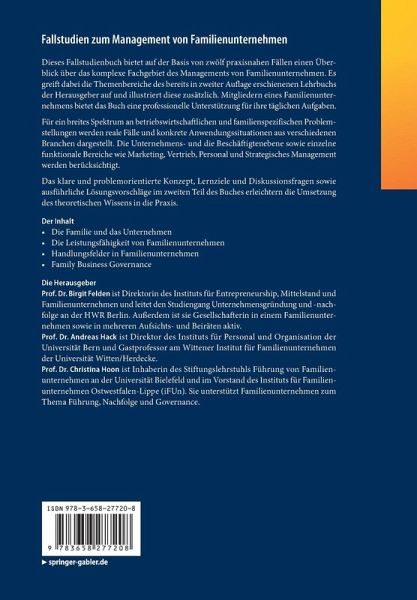 Dieses Fallstudienbuch bietet auf der Basis von zwölf praxisnahen Fällen einen Überblick über das komplexe Fachgebiet des Managements von Familienunternehmen. Es greift dabei die Themenbereiche des bereits in zweiter Auflage erschienenen Lehrbuchs der Herausgeber auf und illustriert diese zusätzlich. Mitgliedern eines Familienunternehmens bietet das Buch eine professionelle Unterstützung für ihre täglichen Aufgaben.