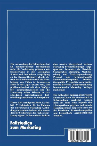 Erstes Kapitel Strategisches Marketing.- Fallstudie KNOPF-GmbH.- Fallstudie TAPE INC..- Fallstudie ELECTRO AG.- Fallstudie BONOS AG.- Kurzhinweise zur Lösung.- Zweites Kapitel Marktforschung und Marktsegmentierung.- Fallstudie SMOKE AG.- Fallstudie COSMETICA.- Fallstudie AUTODRUCK GmbH.- Kurzhinweise zur Lösung.- Drittes Kapitel Produkt- und Sortimentspolitik.- Fallstudie FROST GmbH.- Fallstudie BLITZBLANK.- Fallstudie ELECTRIC AG.- Fallstudie CINEMA GmbH.- Kurzhinweise zur Lösung.- Viertes Kapitel Kommunikationspolitik.- Fallstudie SUPER GmbH.- Fallstudie QUIX AG.- Fallstudie P + S.- Kurzhinweise zur Lösung.- Fünftes Kapitel Distributionspolitik.- Fallstudie SUPER-8-FILM.- Fallstudie MIKROFILM.- Kurzhinweise zur Lösung.- Sechstes Kapitel Preispolitik.- Fallstudie MEMORY.- Fallstudie TENNIS GmbH.- Kurzhinweise zur Lösung.- Siebentes Kapitel Institutionelle Bereiche des Marketing.- Fallstudie WARENHAUS X.- Fallstudie CITY KAUF GmbH.- Fallstudie SCHIRMER AG.- Fallstudie HEINRICH GmbH & Co..- Fallstudie INFOSTAR AG.- Kurzhinweise zur Lösung.- Fallmethode in der Ausbildung.- Fallstudien zum Marketing (Auswahl).