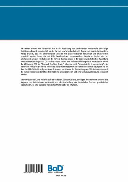 Das Lernen anhand von Fallstudien hat in der Ausbildung von Studierenden mittlerweile eine lange Tradition und wurde ursprünglich an der Harvard Law School entwickelt. Gegen Ende des 19. Jahrhunderts wurde erkannt, dass der Unterrichtsstoff anhand von praxisorientierten Fallstudien viel anschaulicher vermittelt werden kann, als mit Hilfe herkömmlicher Lernmaterialien. Bereits zu Beginn des 20. Jahrhunderts wurden Fallstudien an der Harvard Business School in der betriebswirtschaftlichen Ausbildung von Studierenden eingesetzt.Fallstudien konfrontieren die Studierenden dabei mit Entscheidungsproblemen, wie sie Manager im realen Alltag üblicherweise bewältigen müssen.CTR-Business-Cases stellen eine Weiterentwicklung von Harvard-Fallstudien dar und enthalten alle für die Bearbeitung des Falls notwendigen Informationen. Durch eine sehr anschauliche und plastische Situationsbeschreibung werden die Bearbeiter direkt in ein Unternehmen hineinversetzt. CTR steht dabei für "Compact Teaching Reality" und könnte mit dem Begriff "komprimierte Lernumgebung" übersetzt werden.In der Situationsbeschreibung werden insbesondere die im Unternehmen handelnden Personen vorgestellt und mindestens ein Hauptproblem und diverse Nebenprobleme aufgeworfen. Diese Probleme betreffen dabei i. d. R. mehrere Bereiche der klassischen Betriebswirtschaftslehre.Im Rahmen der Bearbeitung von CTR-Business-Cases soll die wahre Ursache der identifizierten Probleme herausgearbeitet werden und eine wirkungsvolle Lösung entwickelt werden. Es geht also bei der Bearbeitung von CTR-Business-Cases weniger um den Prozess der Informationsgewinnung, sondern viel mehr um die Aufbereitung des Falls und die Auswertung der vorhandenen Informationen. Da bereits in der Fallbeschreibung alle zur Lösung relevanten Informationen enthalten sind, ist eine zusätzliche Recherche von Hintergrundinformationen i. d. R. nicht notwendig.Alle CTR-Business-Cases basieren auf realen Fällen. Zum Schutz des jeweiligen Unternehmens werden alle Angaben zum Unternehmen verfremdet und die Beschreibung der handelnden Personen grundsätzlich anonymisiert. So sind auch alle Dialoge/Nachrichten etc. frei erfunden.