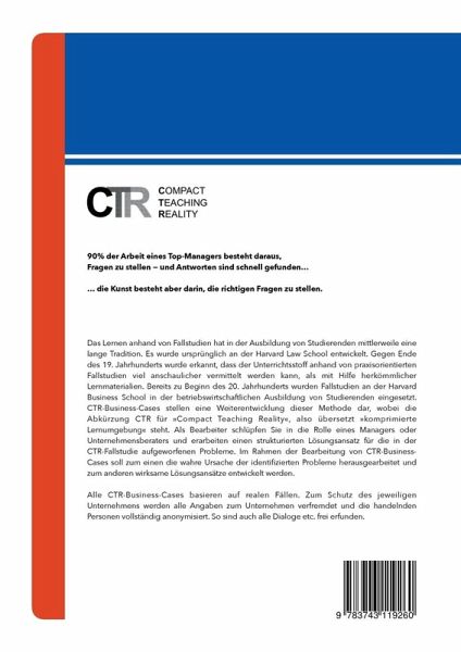 Das Lernen anhand von Fallstudien hat in der Ausbildung von Studierenden mittlerweile eine lange Tradition. Es wurde ursprünglich an der Harvard Law School entwickelt. Gegen Ende des 19. Jahrhunderts wurde erkannt, dass der Unterrichtsstoff anhand von praxisorientierten Fallstudien viel anschaulicher vermittelt werden kann, als mit Hilfe herkömmlicher Lernmaterialien. Bereits zu Beginn des 20. Jahrhunderts wurden Fallstudien an der Harvard Business School in der betriebswirtschaftlichen Ausbildung von Studierenden eingesetzt. CTR-Business-Cases stellen eine Weiterentwicklung dieser Methode dar, wobei die Abkürzung CTR für »Compact Teaching Reality«, also übersetzt »komprimierte Lernumgebung« steht. Als Bearbeiter schlüpfen Sie in die Rolle eines Managers oder Unternehmensberaters und erarbeiten einen strukturierten Lösungsansatz für die in der CTR-Fallstudie aufgeworfenen Probleme. Im Rahmen der Bearbeitung von CTR-Business- Cases soll zum einen die wahre Ursache der identifizierten Probleme herausgearbeitet und zum anderen wirksame Lösungsansätze entwickelt werden.Alle CTR-Business-Cases basieren auf realen Fällen. Zum Schutz des jeweiligen Unternehmens werden alle Angaben zum Unternehmen verfremdet und die handelnden Personen vollständig anonymisiert. So sind auch alle Dialoge etc. frei erfunden.