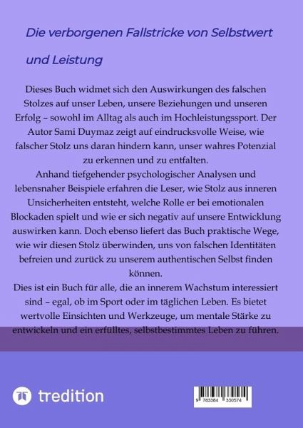 Dieses Buch widmet sich den Auswirkungen des falschen Stolzes auf unser Leben, unsere Beziehungen und unseren Erfolg - sowohl im Alltag als auch im Hochleistungssport. Der Autor Sami Duymaz zeigt auf eindrucksvolle Weise, wie falscher Stolz uns daran hindern kann, unser wahres Potenzial zu erkennen und zu entfalten.Anhand tiefgehender psychologischer Analysen und lebensnaher Beispiele erfahren die Leser, wie Stolz aus inneren Unsicherheiten entsteht, welche Rolle er bei emotionalen Blockaden spielt und wie er sich negativ auf unsere Entwicklung auswirken kann. Doch ebenso liefert das Buch praktische Wege, wie wir diesen Stolz überwinden, uns von falschen Identitäten befreien und zurück zu unserem authentischen Selbst finden können.Dies ist ein Buch für alle, die an innerem Wachstum interessiert sind - egal, ob im Sport oder im täglichen Leben. Es bietet wertvolle Einsichten und Werkzeuge, um mentale Stärke zu entwickeln und ein erfülltes, selbstbestimmtes Leben zu führen.