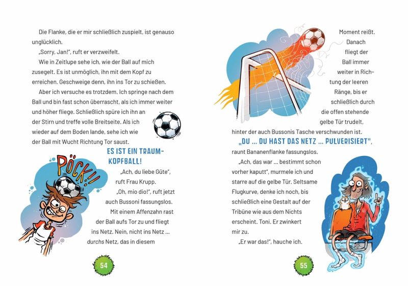 Endlich ist ein Fußballschuh von Toni gefunden. Dies scheint zumindest einen Teil des Fluches außer Kraft zu setzen. Und so schaut Jan nicht schlecht, als Toni Torwartschreck und der Wahrsagehamster Bernd eines morgens in seinem Zimmer stehen. Leider scheint es mit Tonis Zauberkräften nun nicht mehr weit her zu sein. Jedoch kommen die Drei gar nicht lange dazu, sich darüber Gedanken zu machen, warum das so ist und wo der zweite Schuh abgeblieben sein könnte. Die Mannschaft steht endlich im Achtelfinale der Juniorenmeisterschaft, als ein neuer Co-Trainer plötzlich auf den Plan tritt – Lorenzo Bussoni. Toni kommt der gleich so bekannt vor – aber leider ist so ein Geistergedächtnis etwas löchrig. Und obwohl die Mannschaft dank Bussoni ins Trainingscamp nach Italien fahren darf, kommt der Typ allen mehr als suspekt vor. Wie gut, dass die Mannschaft magische Unterstützung hat, die ihn zwischen den Trainingseinheiten im Auge behalten kann.