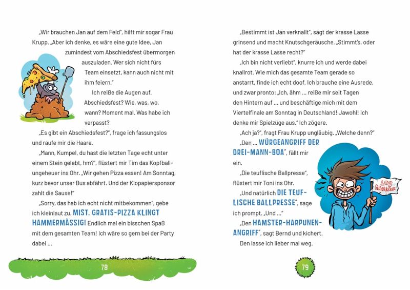 Das Buch las sich ebenso wie der erste Teil sehr flüssig, zauberte mir immer wieder ein Lächeln auf die Lippen und man wollte immer wissen, wie es weiter geht. Zwischendrin hatte ich kurz den Eindruck, dass der Fußball etwas zu kurz kommt, aber das ist vielleicht Geschmackssache. Insgesamt fühlte ich mich wieder sehr gut unterhalten. Unterstützt wurde die Handlung erneut von den coolen comicartigen Zeichnungen von „Der Anton“, welche zusammen mit der Schriftgröße und dem Zeilenabstand für ein angenehmen Leseerlebnis sorgen.