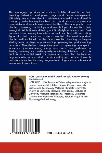 This monograph provides information of false clownfish on their breeding, behavior, development stages and proper management. Ultimately, readers are able to maintain a successful false clownfish rearing by understanding their basic needs and behaviors to provide a comfortable and suitable environment for them. The monograph covers chapters discussing on biology and morphology of clownfish; their ecological distributions and their symbiotic lifestyle with anemones. Feed preparation and rearing tank set-up are well described with supporting figures for both larvae and mature clownfish. The most important chapter well explained on the false clownfish breeding techniques starting from the stages of pre-spawning, spawning and post spawning behaviors. Nevertheless, strong illustration of spawning, embryonic, larvae and juveniles rearing are provided with clear guidelines on feeding, weaning, and water quality monitoring. I believed that this book is an essential asset for aquaculturists and fish hobbyist or beginners who are interested to understand deeper on false clownfish and promote captive breeding program for ecological conservations and environment protections.
