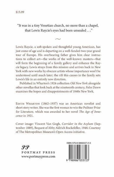 Lewis Raycie, a soft-spoken and thoughtful young American, has just come of age and is departing on a well-funded two-year grand tour of Europe. His overbearing father gives him clear instructions to collect art-the works of the well-known masters-that will form the beginning of a family gallery and enhance the Raycie legacy. Lewis strays from this mission and arrives back in New York with new works by obscure artists whose importance won't be understood until much later; the rift this causes in the family sets Lewis's life in an entirely new direction. Published in Wharton's 1924 collection Old New York alongside other novellas that look back at the nineteenth century, False Dawn examines the hopes and disappointments of 1840s New York.
