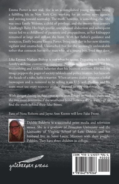 AMAZON TOP 100 CHART-TOPPER!!! ¿ Billionaire playboy ¿ Fiery virgin ¿ Kidnapping ¿ Steamy romance ¿ Former Navy SEALs ¿ Stay-up-late page-turner ¿¿¿¿¿ What an amazingly riveting book! The storyline is fantastic! I have read many romantic suspense books and this one is at the very top of the list! I can see Debbie Baldwin's books becoming as popular as Marie Force's Fatal series! - Victoria (Amazon Review) ¿¿¿¿¿ Wow, that lust! Baldwin's characters are multi layered, that reveal themselves bit by bit. Making you want to devour the entire book in one sitting, which I did. - Dive into a Good Book (GR Review) ¿¿¿¿¿ Outstanding! A Must Read! I stayed up most of night finishing the book. Be prepared to bite all your nails off. - PLP (GR Review) Emma Porter is not real. She is an accomplished young woman, living a fulfilling life in New York City, working for an online news agency, and striving toward normalcy. The truth, however, is something else. She was once Emily Webster, a child of privilege, and the twenty-first-century Lindbergh Baby. Her high-profile, unexplained abduction and subsequent rescue led to a childhood of paranoia and preparedness, as her kidnapper remained at large and still on the hunt. With her father's guidance and resources, Emily became Emma Porter, living each day in her new identity, vigilant and unattached. Unattached but for the seemingly unbreakable tether that connects her to the man who, as a young boy, lived next door. Like Emma, Nathan Bishop is not what he seems. Preparing to helm his family's defense contracting company, Nathan is better known for his womanizing and reckless behavior than his business acumen. His striking image peppers the pages of society tabloids and police blotters, but beneath the facade of a rake lurks a warrior. When an arms dealer procures a lethal bioweapon and is rumored to be selling it on U.S. soil, Nathan and his team must use every resource at their disposal to stop the threat. With danger closing in, fate, once again, puts Emma in Nathan's path, and the two must determine if the weathered bond between them is enough to find the truth behind their false fronts. Fans of Nora Roberts and Jayne Ann Krentz will love False Front. Be advised: this story contains scenes of violence equivalent to an R-rated movie and explicit sexual situations.