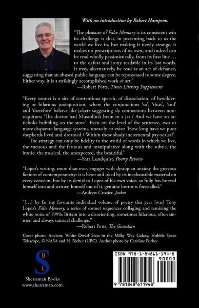 "[...] by far my favourite individual volume of poetry this year [was] Tony Lopez's False Memory, a series of sonnet sequences collaging and remixing the white noise of 1990s Britain into a disorienting, sometimes hilarious, often sinister, and always satirical challenge." -Robert Potts, The Guardian, 6 December 2003."