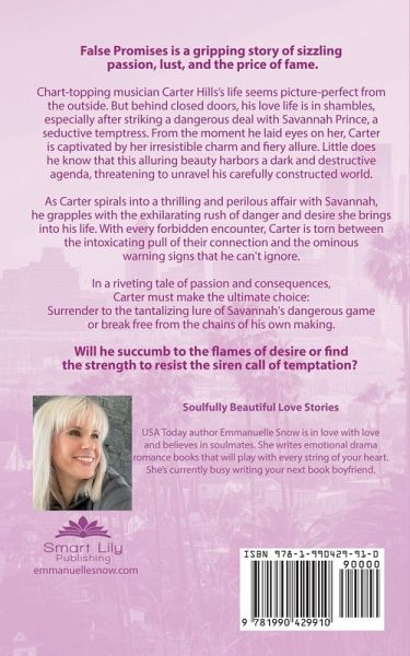 False Promises is a sizzling tale of lust, betrayal, and the dark side of fame. Get ready for a story of passion, danger, and heartache that will leave you breathless. Perfect for fans of Jennifer Hartmann, Paige Toon, Rebecca Yarros, and Mia Sheridan. From the outside, Carter Hills's life looks like a dream. He's a chart-topping musician with adoring fans and a career that's unstoppable. But behind the scenes, his personal life is a disaster, made worse by the alluring and enigmatic Savannah Prince. She's the kind of woman who turns heads and leaves chaos in her wake. From the moment she catches Carter's eye, he's drawn into her web of seduction and danger. Savannah has secrets-deep, dark secrets that could destroy Carter's career and everything he's worked for. Yet, he's captivated by her intensity, her unpredictable nature, and the electric chemistry between them. As their relationship spirals into a whirlwind of passion and turmoil, Carter finds himself torn between the thrill of Savannah's company and the cold reality of the danger she represents. Every encounter is a step closer to the edge, and every glance is a promise of more. Carter must decide if he's willing to risk everything for the rush of being with Savannah. Can he resist the magnetic pull of her charm, or will he lose himself in her intoxicating world? The stakes are high, and the consequences could be catastrophic. False Promises is a rollercoaster of emotions, a journey through the highs and lows of love and loss, where the desire for fame clashes with the yearning for something real. As Carter navigates the treacherous waters of his tumultuous affair, he discovers that not all promises are meant to be kept, and some can lead to a path of destruction. False Promises is a standalone novel in the Carter Hills Band series where women's fiction meets romance.