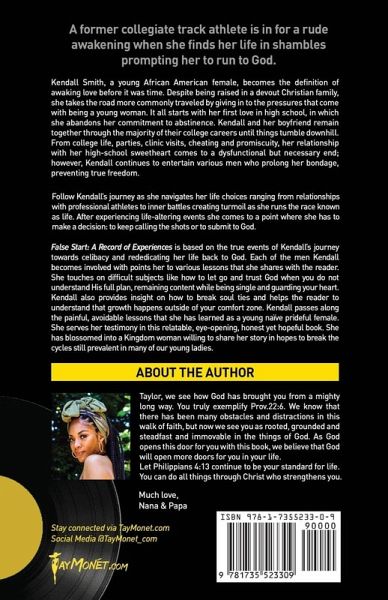 A former collegiate track athlete is in for a rude awakening when she finds her life in shambles prompting her to run to God. Kendall Smith, a young African American female, becomes the definition of awaking love before it was time. Despite being raised in a devout Christian family, she takes the road more commonly traveled by giving in to the pressures that come with being a young woman. It all starts with her first love in high school, in which she abandons her commitment to abstinence. Kendall and her boyfriend remain together through the majority of their college careers until things tumble downhill. From college life, parties, clinic visits, cheating and promiscuity, her relationship with her high-school sweetheart comes to a dysfunctional but necessary end; however, Kendall continues to entertain various men who prolong her bondage, preventing true freedom. Follow Kendall's journey as she navigates her life choices ranging from relationships with professional athletes to inner battles creating turmoil as she runs the race known as life. After experiencing life-altering events she comes to a point where she has to make a decision: to keep calling the shots or to submit to God. False Start: A Record of Experiences is based on the true events of Kendall's journey towards celibacy and rededicating her life back to God. Each of the men Kendall becomes involved with points her to various lessons that she shares with the reader. She touches on difficult subjects like how to let go and trust God when you do not understand His full plan, remaining content while being single and guarding your heart. Kendall also provides insight on how to break soul ties and helps the reader to understand that growth happens outside of your comfort zone. Kendall passes along the painful, avoidable lessons that she has learned as a young naïve prideful female. She serves her testimony in this relatable, eye-opening, honest yet hopeful book. She has blossomed into a Kingdom woman willing to share her story in hopes to break the cycles still prevalent in many of our young ladies.