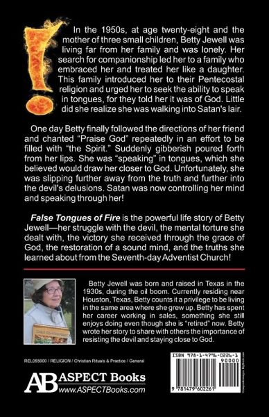 In the 1950s, at age twenty-eight and the mother of three small children, Betty Jewell was living far from her family and was lonely. Her search for companionship led her to a family who embraced her and treated her like a daughter. This family introduced her to their Pentecostal religion and urged her to seek the ability to speak in tongues, for they told her it was of God. Little did she realize she was walking into Satan's lair. One day Betty finally followed the directions of her friend and chanted "Praise God" repeatedly in an effort to be filled with "the Spirit." Suddenly gibberish poured forth from her lips. She was "speaking" in tongues, which she believed would draw her closer to God. Unfortunately, she was slipping further away from the truth and further into the devil's delusions. Satan was now controlling her mind and speaking through her! False Tongues of Fire is the powerful life story of Betty Jewell-her struggle with the devil, the mental torture she dealt with, the victory she received through the grace of God, the restoration of a sound mind, and the truths she learned about from the Seventh-day Adventist Church!