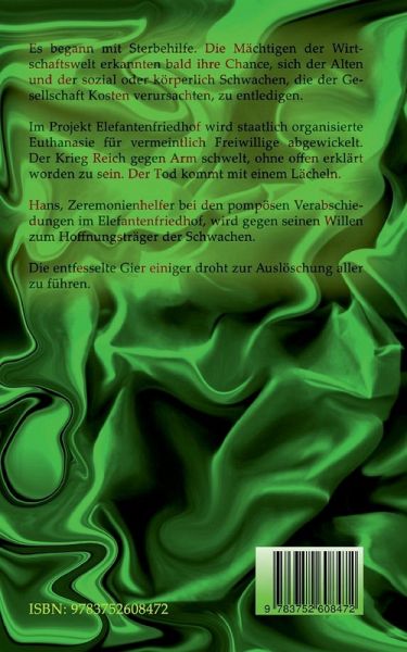 Es begann mit Sterbehilfe. Die Mächtigen der Wirtschaftswelt erkannten bald ihre Chance, sich der Alten und der sozial oder körperlich Schwachen, die der Gesellschaft Kosten verursachten, zu entledigen.Im Projekt Elefantenfriedhof wird staatlich organisierte Euthanasie für vermeintlich Freiwillige abgewickelt. Der Krieg Reich gegen Arm schwelt, ohne offen erklärt worden zu sein. Der Tod kommt mit einem Lächeln.Hans, Zeremonienhelfer bei den pompösen Verabschiedungen im Elefantenfriedhof, wird gegen seinen Willen zum Hoffnungsträger der Schwachen.Die entfesselte Gier einiger droht zur Auslöschung aller zu führen.