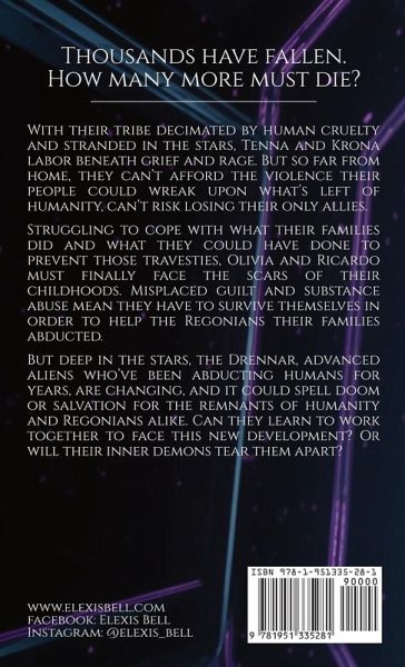 *Illustrated Edition* With their tribe decimated by human cruelty and stranded in the stars, Tenna and Krona labor beneath grief and rage. But so far from home, they can't afford the violence their people could wreak upon what's left of humanity, can't risk losing their only allies. Struggling to cope with what their families did and what they could have done to prevent those travesties, Olivia and Ricardo must finally face the scars of their childhoods. Misplaced guilt and substance abuse mean they have to survive themselves in order to help the Regonians their families abducted. But deep in the stars, the Drennar, advanced aliens who've been abducting humans for years, are changing, and it could spell doom or salvation for the remnants of humanity and Regonians alike. Can they learn to work together to face this new development? Or will their inner demons tear them apart?