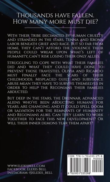 With their tribe decimated by human cruelty and stranded in the stars, Tenna and Krona labor beneath grief and rage. But so far from home, they can't afford the violence their people could wreak upon what's left of humanity, can't risk losing their only allies. Struggling to cope with what their families did and what they could have done to prevent those travesties, Olivia and Ricardo must finally face the scars of their childhoods. Misplaced guilt and substance abuse mean they have to survive themselves in order to help the Regonians their families abducted. But deep in the stars, the Drennar, advanced aliens who've been abducting humans for years, are changing, and it could spell doom or salvation for the remnants of humanity and Regonians alike. Can they learn to work together to face this new development? Or will their inner demons tear them apart?