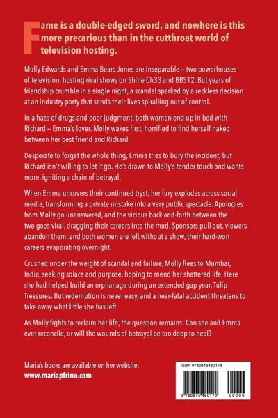 Fame is a double-edged sword, and nowhere is this more precarious than in the cutthroat world of television hosting. Molly Edwards and Emma Bears Jones are inseparable-two powerhouses of television, hosting rival shows on Shine Ch33 and BBS12. But years of friendship crumble in a single night, a scandal sparked by a reckless decision at an industry party that sends their lives spiralling out of control. In a haze of drugs and poor judgment, both women end up in bed with Richard-Emma's lover. Molly wakes first, horrified to find herself naked between her best friend and Richard. Desperate to forget the whole thing, Emma tries to bury the incident, but Richard isn't willing to let it go. He's drawn to Molly's tender touch and wants more, igniting a chain of betrayal. When Emma uncovers their continued tryst, her fury explodes across social media, transforming a private mistake into a very public spectacle. Apologies from Molly go unanswered, and the vicious back-and-forth between the two goes viral, dragging their careers into the mud. Sponsors pull out, viewers abandon them, and both women are left without a show, their hard-won careers evaporating overnight. Crushed under the weight of scandal and failure, Molly flees to Mumbai, India, seeking solace and purpose, hoping to mend her shattered life. Here she had helped build an orphanage during an extended gap year, Tulip Treasures. But redemption is never easy, and a near-fatal accident threatens to take away what little she has left. As Molly fights to reclaim her life, the question remains: Can she and Emma ever reconcile, or will the wounds of betrayal be too deep to heal?