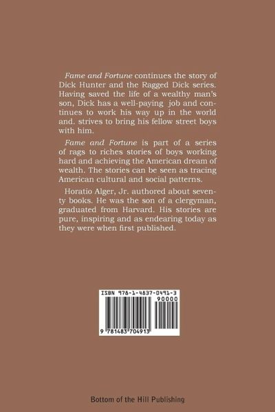 Fame and Fortune continues the story of Dick Hunter and the Ragged Dick series. Having saved the life of a wealthy man's son, Dick has a well-paying job and continues to work his way up in the world and. strives to bring his fellow street boys with him. Fame and Fortune is part of a series of rags to riches stories of boys working hard and achieving the American dream of wealth. The stories can be seen as tracing American cultural and social patterns.