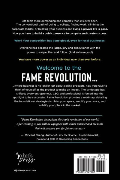 Life feels more demanding and complex than it's ever been. The conventional path of going to college, finding work, climbing the corporate ladder, or building your business and living a private life is gone. Now you have to build a public presence to compete and create success. Why? Your competition has gone global, even for local businesses. Everyone has become the judge, jury and executioner with the power to swipe, like, and follow. (And so have you!) You have more power as an individual now than ever before.Welcome to theFame Revolution... ...where business is no longer just about selling products, now you have to think of yourself as the product to make an impact. The landscape has shifted; every entrepreneur, CEO, and professional is forced into the spotlight to be successful. Fame Revolution provides a roadmap, detailing the foundational strategies to claim your space, amplify your voice, and solidify your place in the market.