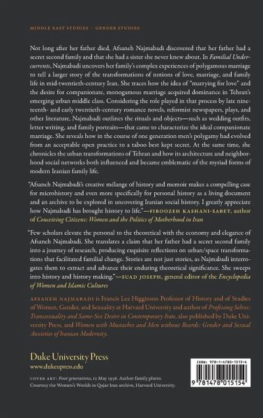 Not long after her father died, Afsaneh Najmabadi discovered that her father had a secret second family and that she had a sister she never knew about. In Familial Undercurrents, Najmabadi uncovers her family's complex experiences of polygamous marriage to tell a larger story of the transformations of notions of love, marriage, and family life in mid-twentieth-century Iran. She traces how the idea of "marrying for love" and the desire for companionate, monogamous marriage acquired dominance in Tehran's emerging urban middle class. Considering the role played in that process by late nineteenth- and early twentieth-century romance novels, reformist newspapers, plays, and other literature, Najmabadi outlines the rituals and objects---such as wedding outfits, letter writing, and family portraits---that came to characterize the ideal companionate marriage. She reveals how in the course of one generation men's polygamy had evolved from an acceptable open practice to a taboo best kept secret. At the same time, she chronicles the urban transformations of Tehran and how its architecture and neighborhood social networks both influenced and became emblematic of the myriad forms of modern Iranian family life.