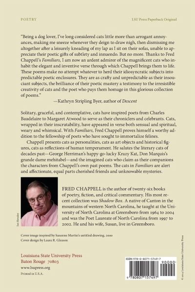 Solitary, graceful, and contemplative, cats have inspired poets from Charles Baudelaire to Margaret Atwood to serve as their chroniclers and celebrants. They have appeared, wrapped in their inscrutability, in verse both sensual and spiritual, weary and whimsical. With Familiars, Fred Chappell proves himself a worthy addition to the fellowship of poets who have sought to immortalize their beloved cats. Here are cats as personalities, cats as art objects and historical figures, cats as reflections of human temperament. Chappell salutes the literary cats of decades past-George Herriman's happy-go-lucky Krazy Kat, Don Marquis's grande dame mehitabel-and the imagined cats who claim as their companions the characters from Chappell's own past poems. The cats in Familiars are alert and affectionate, equal parts cherished friends and unknowable mysteries.