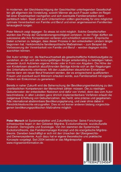 In modernen, der Gleichberechtigung der Geschlechter unterliegenden Gesellschaften, gilt allgemein die Vorstellung, sowohl Männer als auch Frauen sollten im Regelfall einer Erwerbsarbeit nachgehen und sich eventuelle Familienarbeiten dann paritätisch teilen. Staat und auch Unternehmen sollten gleichzeitig für eine möglichst optimale Vereinbarkeit von Familie und Beruf und einen angemessenen Familienlastenausgleich sorgen. Peter Mersch zeigt dagegen: So etwas ist nicht möglich. Solche Gesellschaften würden das Prinzip der Generationengerechtigkeit verletzen. In der Folge dürften sie sukzessive alle ihre Kompetenzen verlieren und schließlich verarmen. Empirische Daten scheinen zu belegen, dass dieser Prozess in den entwickelten Ländern längst begonnen hat. Herkömmliche familienpolitische Maßnahmen - zum Beispiel die Verbesserung der Vereinbarkeit von Familie und Beruf - werden dagegen nichts ausrichten können. Der Autor schlägt vor, die Nachwuchsarbeit als gesellschaftliche Kollektivaufgabe zu verstehen, an der sich alle leistungsfähigen Bürger anteilsmäßig zu beteiligen haben, entweder durch Aufziehen eigener Kinder oder in Form von Abgaben. Die Höhe der von Kinderlosen steuerlich abzuführenden Beträge könnte sich an den Regelungen des Unterhaltsrechts orientieren. Mit den zusätzlichen steuerlichen Einnahmen könnte dann ein neuer Beruf finanziert werden, der es entsprechend qualifizierten Frauen und eventuell auch Männern erlauben würde, aus Familienarbeit mit eigenen Kindern ein Einkommen zu generieren. Bereits in naher Zukunft wird die Beherrschung der Bevölkerungsentwicklung zu den unerlässlichen Kompetenzen der Menschheit zählen müssen. Die zu niedrigen Geburtenraten der entwickelten Nationen sind dafür von Vorteil, denn das vom Autor beschriebene, in allen Ländern ganz ähnlich implementierbare Verfahren erlaubt die zielgenaue Erhöhung von Geburtenzahlen, das heißt, eine präzise und gegebenenfalls international abstimmbare Bevölkerungsplanung, und zwarohne dabei in Persönlichkeitsrechte einzugreifen. Dies ist mit keiner anderen bislang vorgeschlagenen bevölkerungspolitischen Maßnahme möglich.