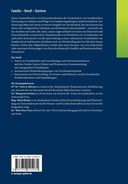 Dieser Sammelband ist eine Bestandsaufnahme der Vereinbarkeit von Familienleben (Betreuung von Kindern und Pflege von Familienangehörigen) und Erwerbsleben. Der Fokus liegt dabei auf einem erweiterten Begriff von Vereinbarkeit, der eine Karriere im Sinne einer erfolgreichen Teilnahme am Arbeitsmarkt miteinschließt - und nicht nur das Ausüben eines Jobs. Die Autor_innen zeigen anhand von Daten aus Österreich und Deutschland die wesentlichen Charakteristika von Problemen zur Vereinbarkeit auf und stellen Instrumente vor, die einen Beitrag zu einer verbesserten Vereinbarkeit von Familie, Beruf und Karriere und damit auch zur Gleichstellung der Geschlechter leisten können. Neben den Möglichkeiten werden aber auch Grenzen, wie etwa körperliche oder emotionale Belastungen, vor allem aber finanzielle Ausfälle und Karrierenachteile, thematisiert.