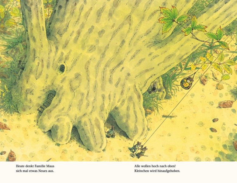 nach oben. Mit Hilfe eines Flaschenzuges, an dem ein Korb hängt, werden alle Mäuse auf einen Baum…mehrAuf dem Cover sehen wir die ganze Mäuseschar, unterschiedlich gekleidet und so können wir sie später gut zuordnen, was meinen Enkeln viel Freude macht.